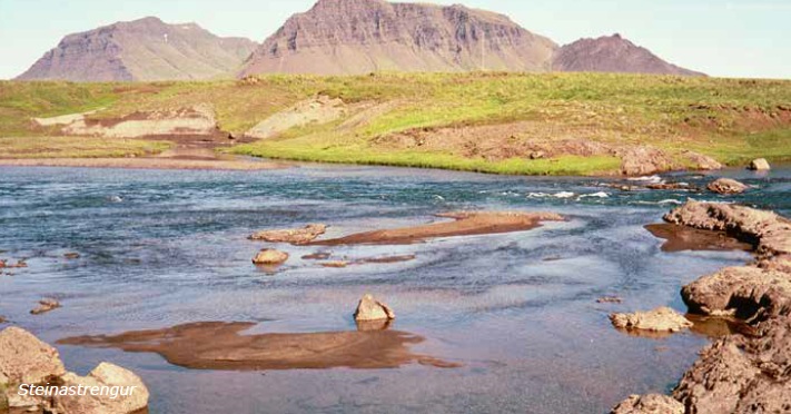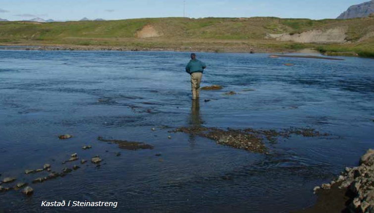 Veiðistaður 128 Steinastrengur - Steinastrengur er hraður strengur sem kemur á milli kletta í miðri ánni. Kantur er meðfram strengnum að austanverðu og liggur fiskur oft við hann og niður að steini sem brýtur á. Einnig stoppar oft fiskur í stútnum á strengnum, sérstaklega þegar fiskur er að ganga. Hægt er að veiða Steinastreng beggja vegna ár.