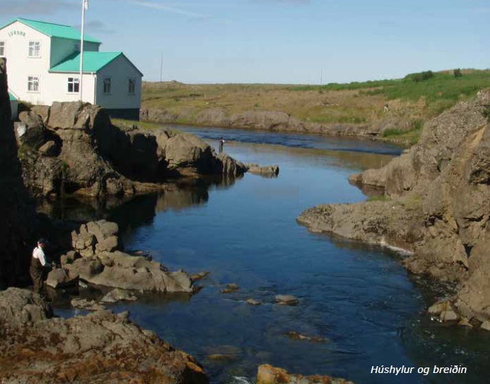 Veiðistaður 134 Breiðin - Breiðin er veiðistaðurinn beint fyrir neðan veiðihúsið Lund. Breiðin er veidd húsmegin og liggur fiskurinn í gjánni sem gengur í gegn um klöppina í botninum. Fiskur getur legið frá broti og upp alla gjánna og fer það mest eftir vatnsmagni hvar hann er. Á göngutíma er hann oftast í miðri gjánni og niður að broti. Fara þarf nokkuð varlega við veiðar í Breiðinni og best fer að nota flotlínu með löngum taumi á. Gátutúpa fer afskaplega vel á þessum stað. En eftir að fiskur tekur þá getur verið þrautin þyngri að ná honum á land. Passa þarf vel að fiskurinn nuddi sér ekki í mosann sem er í kantinum á gjánni. Oft er gott að reyna að teyma fiskinn annað hvort upp fyrir gjánna eða niður í næsta veiðistað fyrir neðan og þreyta hann þar.