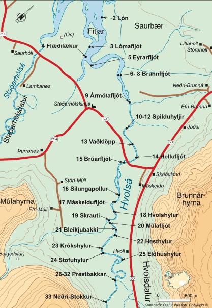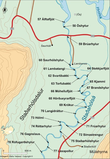 60 Saurhólshylur: Ég kalla hann gjarnan Lambanesfljót. Þetta var sterkur veiðistaður í kringum 1990 en það hefur fjarað svolítið undan honum. Hann hefur fyllst talsvert af leir og drullu sem var ekki í honum áður. Það kemur skurður í bakkann Saurhólsmegin. Bæði efst þar sem rennur inn í hann, um það bil fimm metra niður af skurðinum var gríðarlega mikil veiði hér áður fyrr. Ég man að þegar ég opnaði ána 20. júní, árið 1991 þá veiddi ég þarna átta laxa á þessum bletti. Það er um að gera að kíkja þarna við.